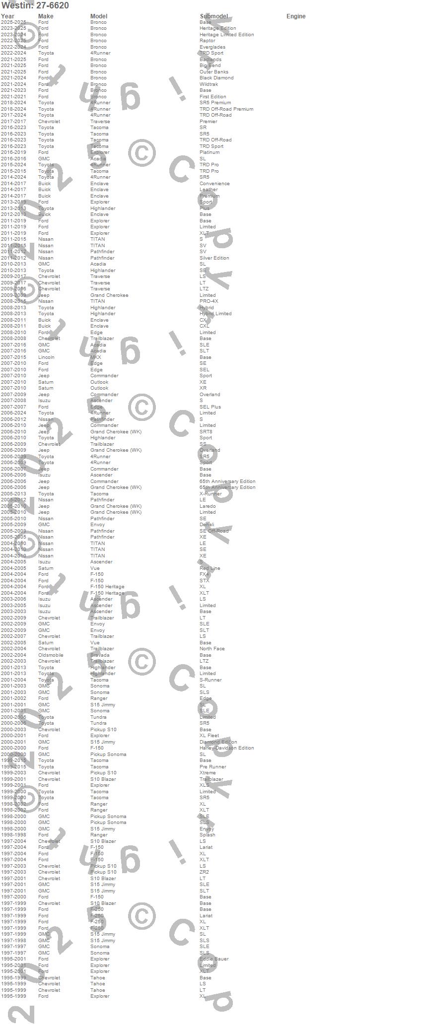 4Runner, Acadia, Ascender, Bravada, Bronco, Commander, Edge, Enclave, Envoy, Explorer, F-150, F-150 Heritage, F-250, Grand Cherokee, Grand Cherokee (WK), Highlander, MKX, Outlook, Pathfinder, Ranger