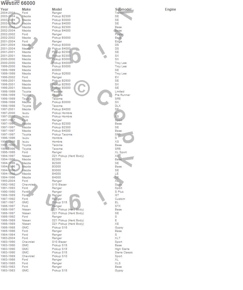 B2300, B2500, B3000, B4000, D21 Pickup (Hard Body), Hombre, Ranger, S10 Blazer, S10 Pickup, S15 Pickup, Tacoma, Chevrolet, Ford, GMC, Isuzu, Mazda, Nissan, Toyota, 2004, 2003