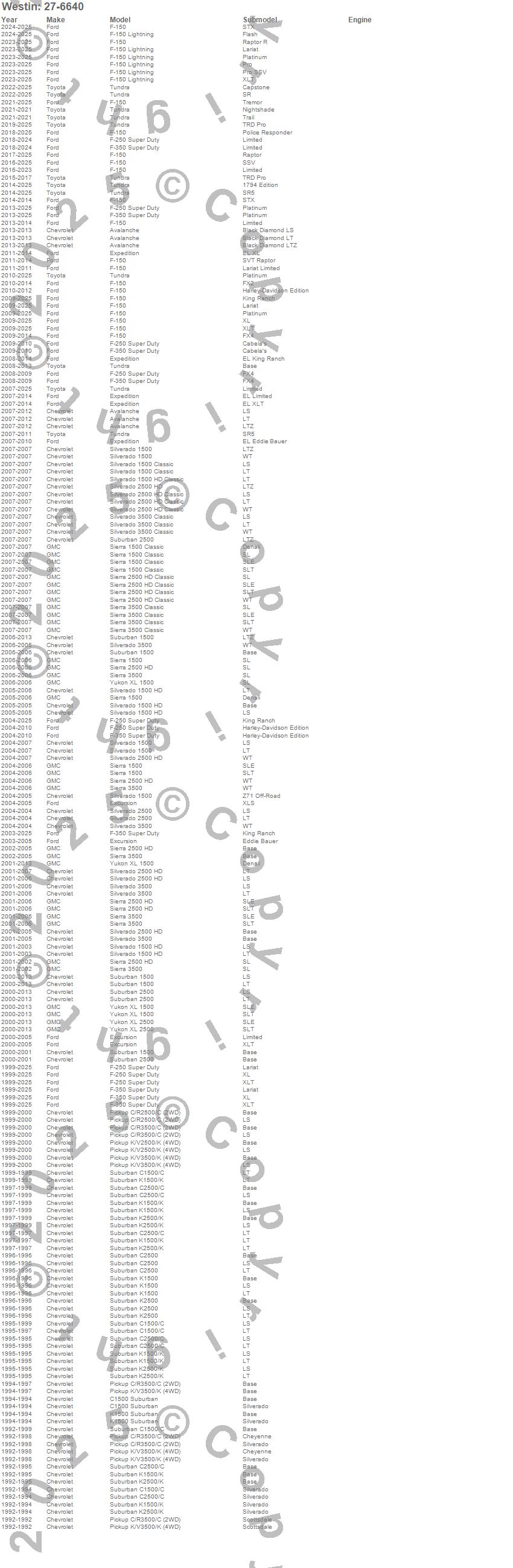 Avalanche, C1500 Suburban, C2500 Pickup, C2500 Suburban, C3500 Pickup, Excursion, Expedition, F-150, F-150 Lightning, F-250 Super Duty, F-350 Super Duty, F-450 Super Duty, F-550 Super Duty, K1500 Suburban, K2500 Pickup, K2500 Suburban, K3500 Pickup, Sierra 1500, Sierra 1500 Classic, Sierra 2500 HD