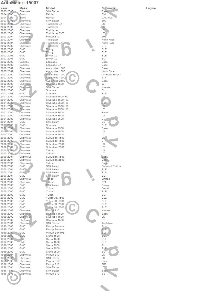 Avalanche 1500, Avalanche 2500, Envoy, Envoy XL, Escalade, Escalade EXT, Rainier, S10 Blazer, S10 Pickup, S15 Jimmy, Sierra 1500, Sierra 2500, Silverado 1500, Silverado 1500 HD, Silverado 2500, Silverado 2500 HD, Silverado 3500, Sonoma, Suburban 1500, Suburban 2500