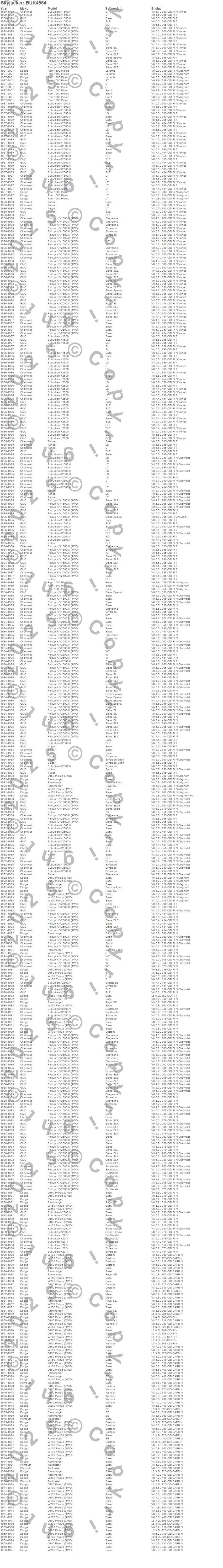 Blazer, C3500 Pickup, D100 Pickup, D150 Pickup, D300 Pickup, K1500, K1500 Pickup, K1500 Suburban, K2500 Pickup, K2500 Suburban, Ram 1500, Ramcharger, Tahoe, Trailduster, V20 Suburban, V2500 Suburban, W100 Pickup, W150 Pickup, W200 Pickup, W250 Pickup