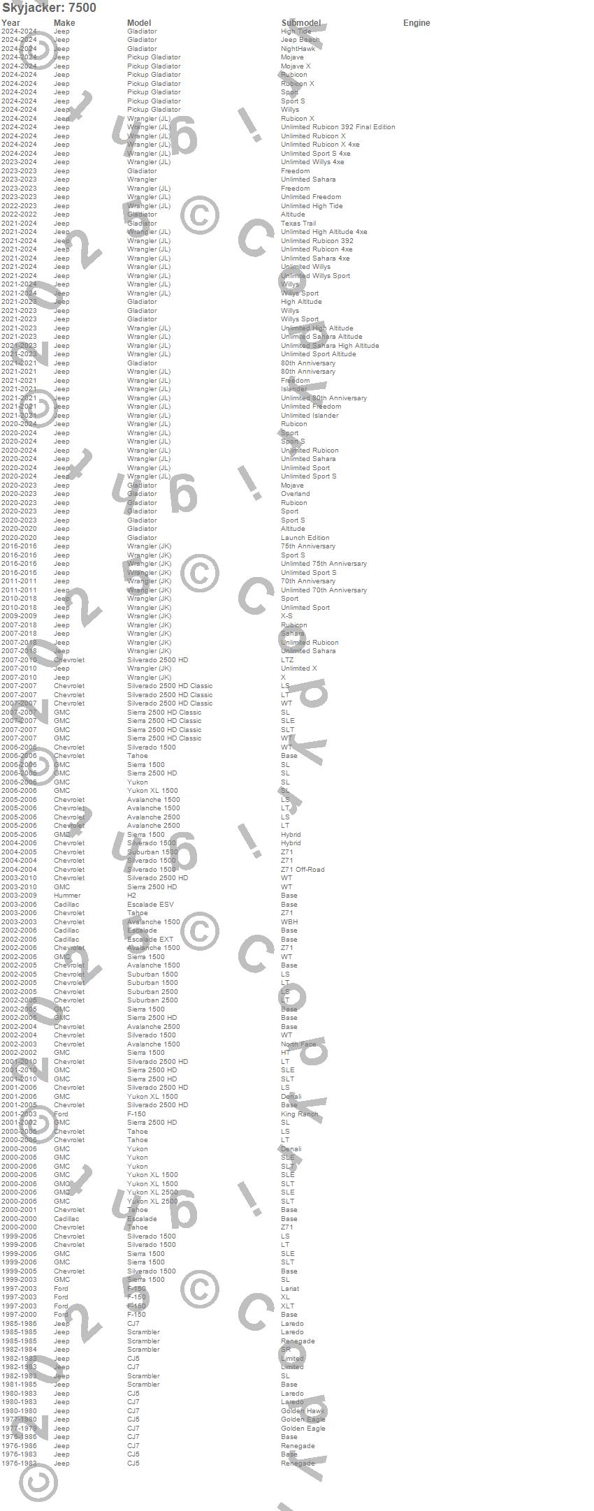 Avalanche 1500, Avalanche 2500, CJ5, CJ7, Escalade, Escalade ESV, Escalade EXT, F-150, Gladiator, H2, Pickup Gladiator, Scrambler, Sierra 1500, Sierra 2500 HD, Sierra 2500 HD Classic, Silverado 1500, Silverado 2500 HD, Silverado 2500 HD Classic, Suburban 1500, Suburban 2500