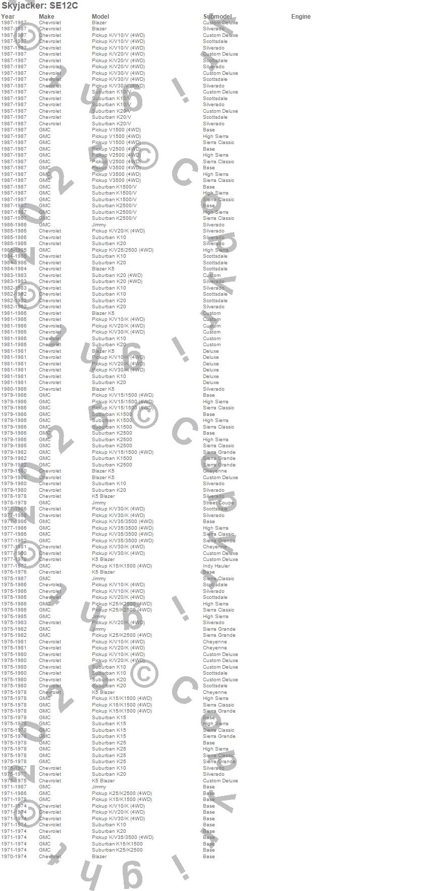 Blazer, Blazer K5, Jimmy, K10 Pickup, K10 Suburban, K15 Suburban, K15/K1500 Suburban, K1500 Pickup, K1500 Suburban, K20 Pickup, K20 Suburban, K25 Pickup, K25 Suburban, K25/K2500 Pickup, K25/K2500 Suburban, K2500 Pickup, K2500 Suburban, K30 Pickup, K35 Pickup, K35/K3500 Pickup