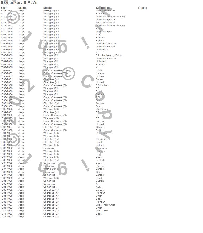 Cherokee (SJ), Cherokee (XJ), Comanche, Grand Cherokee (WJ), Grand Cherokee (ZJ), Wrangler (JK), Wrangler (TJ), Wrangler (YJ), Jeep, 2016, 2015, 2014, 2013, 2012, 2011, 2010, 2009, 2008, 2007, 2006