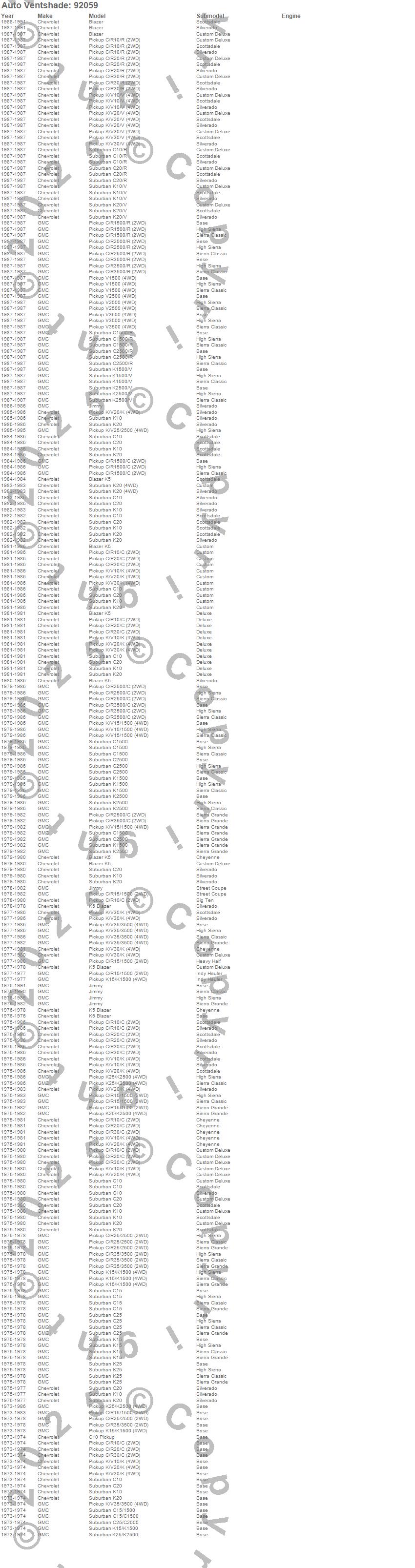 Blazer, Blazer K5, C10 Pickup, C10 Suburban, C15 Suburban, C15/C1500 Suburban, C1500 Pickup, C1500 Suburban, C20 Pickup, C20 Suburban, C25 Suburban, C25/C2500 Pickup, C25/C2500 Suburban, C2500 Pickup, C2500 Suburban, C30 Pickup, C35/C3500 Pickup, C3500 Pickup, Jimmy, K10 Pickup