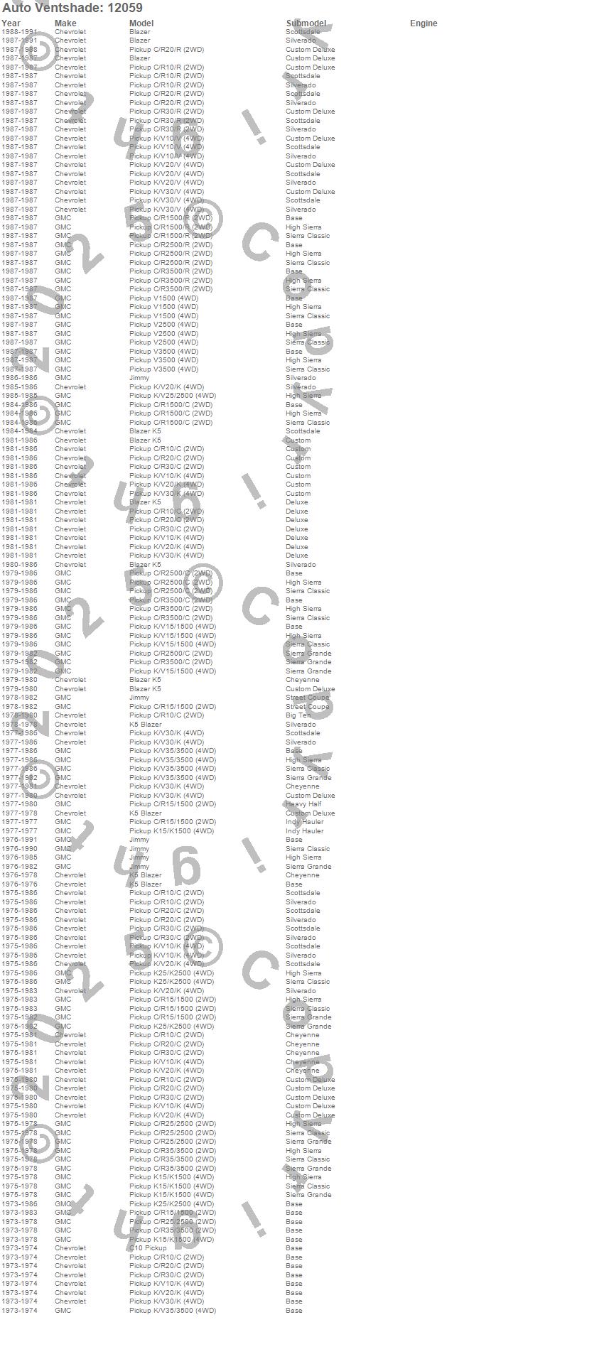 Blazer, Blazer K5, C10 Pickup, C1500 Pickup, C20 Pickup, C25/C2500 Pickup, C2500 Pickup, C30 Pickup, C35/C3500 Pickup, C3500 Pickup, Jimmy, K10 Pickup, K1500 Pickup, K20 Pickup, K25 Pickup, K25/K2500 Pickup, K2500 Pickup, K30 Pickup, K35 Pickup, K35/K3500 Pickup