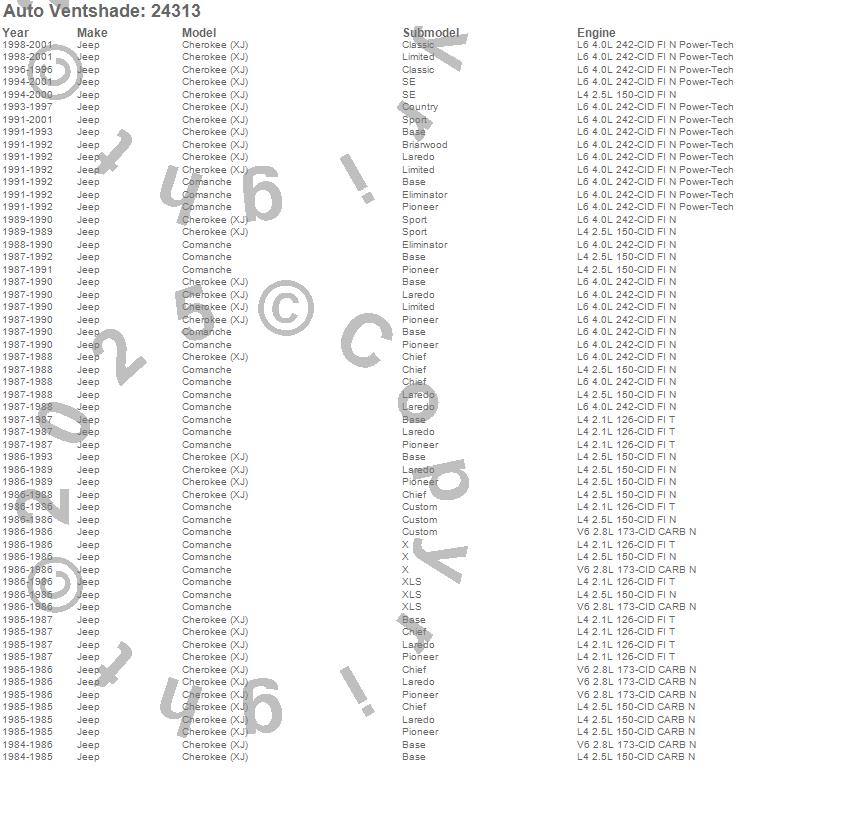Cherokee (XJ), Comanche, Jeep, 2001, 2000, 1999, 1998, 1997, 1996, 1995, 1994, 1993, 1992, 1991, 1990, 1989, 1988, 1987, 1986, 1985