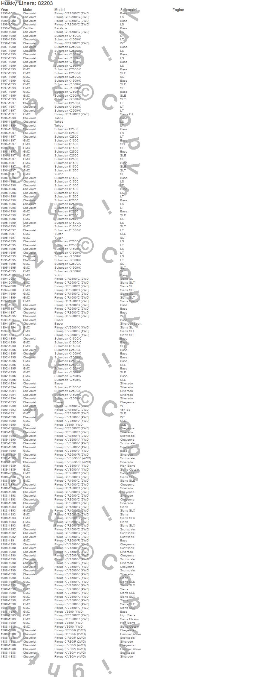 Blazer, C1500 Pickup, C1500 Suburban, C2500 Pickup, C2500 Suburban, C3500 Pickup, Escalade, K1500 Pickup, K1500 Suburban, K2500 Pickup, K2500 Suburban, K3500 Pickup, R2500 Pickup, R30 Pickup, R3500 Pickup, Tahoe, V30 Pickup, V3500 Pickup, Yukon, Cadillac