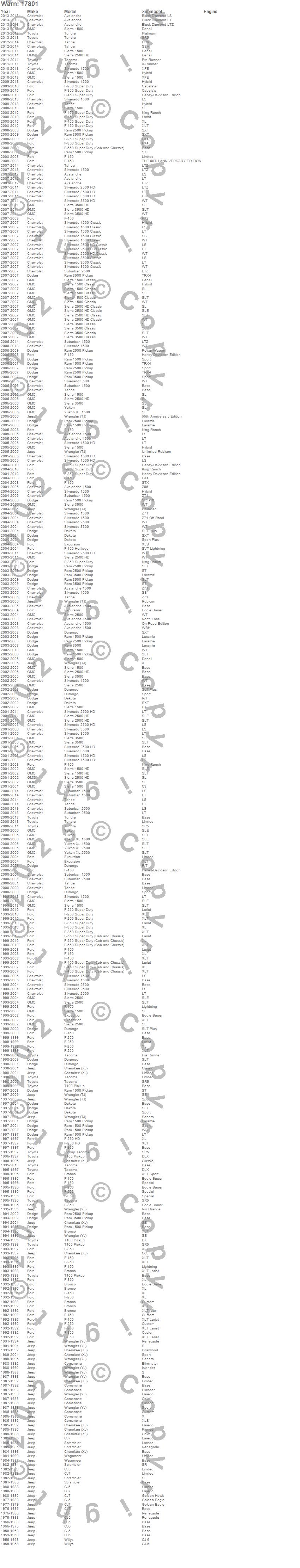 Avalanche, Avalanche 1500, Bronco, Cherokee (XJ), CJ5, CJ6, CJ7, Comanche, Dakota, Durango, Excursion, Expedition, F-150, F-150 Heritage, F-250, F-250 HD, F-250 Super Duty, F-350, F-350 Super Duty, F-450 Super Duty