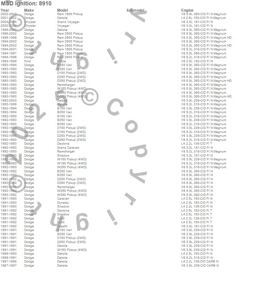 B150 Van, B250 Van, B350 Van, Caravan, D150 Pickup, D250 Pickup, D350 Pickup, Dakota, Daytona, Dynasty, Grand Caravan, Grand Voyager, Probe, Ram 1500, Ram 2500, Ram 3500, Ramcharger, Shadow, Spirit, Stealth