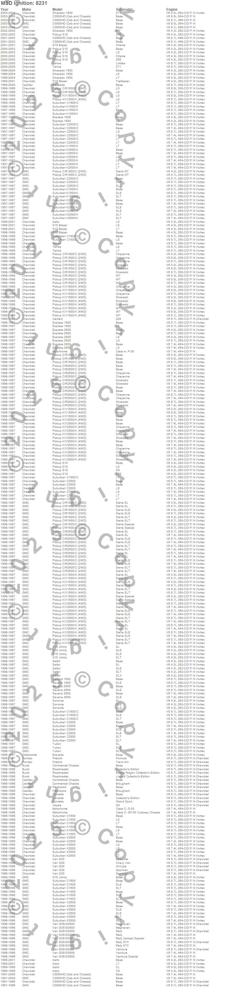 Astro, Bravada, C1500 Pickup, C1500 Suburban, C2500 Pickup, C2500 Suburban, C3500 Pickup, C3500HD, Camaro, Commercial Chassis, Corvette, Escalade, Express 1500, Express 2500, Express 3500, Firebird, Fleetwood, G30 Van, G35/G3500 Van, Impala