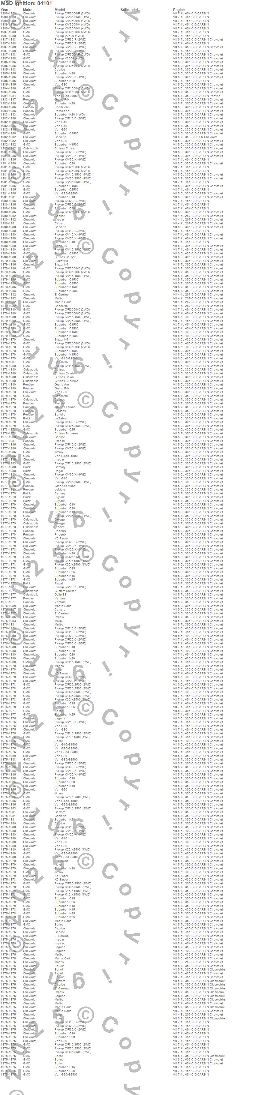 Bel Air, Blazer K5, Bonneville, C10 Pickup, C10 Suburban, C15 Suburban, C1500 Pickup, C1500 Suburban, C20 Pickup, C20 Suburban, C25 Suburban, C25/C2500 Pickup, C2500 Pickup, C2500 Suburban, C30 Pickup, C35/C3500 Pickup, C3500 Pickup, Caballero, Camaro, Caprice