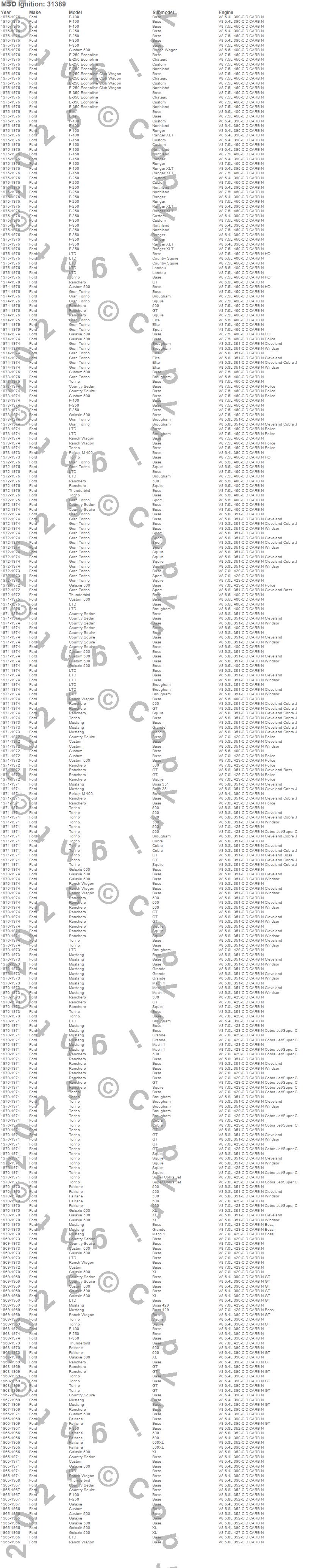 Country Sedan, Country Squire, Custom, Custom 500, E-250 Econoline, E-250 Econoline Club Wagon, E-350 Econoline, Elite, F-100, F-150, F-250, F-350, Fairlane, Galaxie, Galaxie 500, Gran Torino, LTD, M-400 Pickup, Mustang, Ranch Wagon