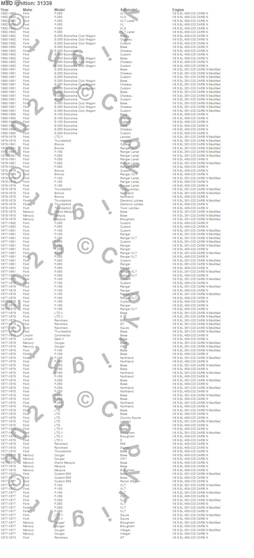 Bronco, Continental, Cougar, Custom 500, E-100 Econoline, E-250 Econoline, E-250 Econoline Club Wagon, E-350 Econoline, E-350 Econoline Club Wagon, F-100, F-150, F-250, F-350, Grand Marquis, LTD, LTD II, Mark V, Marquis, Ranchero, Thunderbird