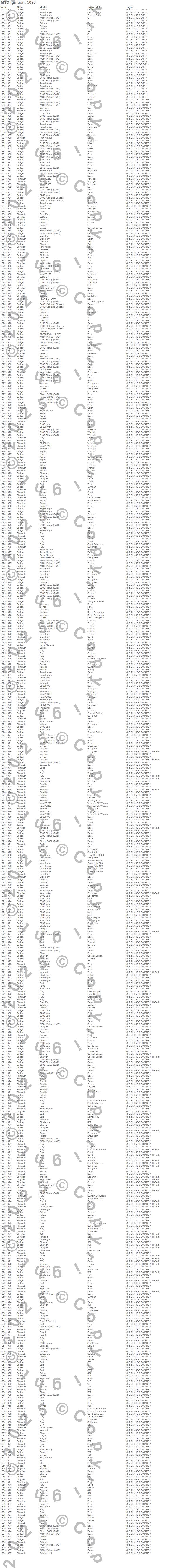 300, A100 Pickup, A100 Van, Aspen, B100 Van, B150 Van, B200 Van, B250 Van, B300 Van, B350 Van, Barracuda, Belvedere, Belvedere II, CB300 Van, Challenger, Charger, Cordoba, Coronet, Cuda, D100 Pickup