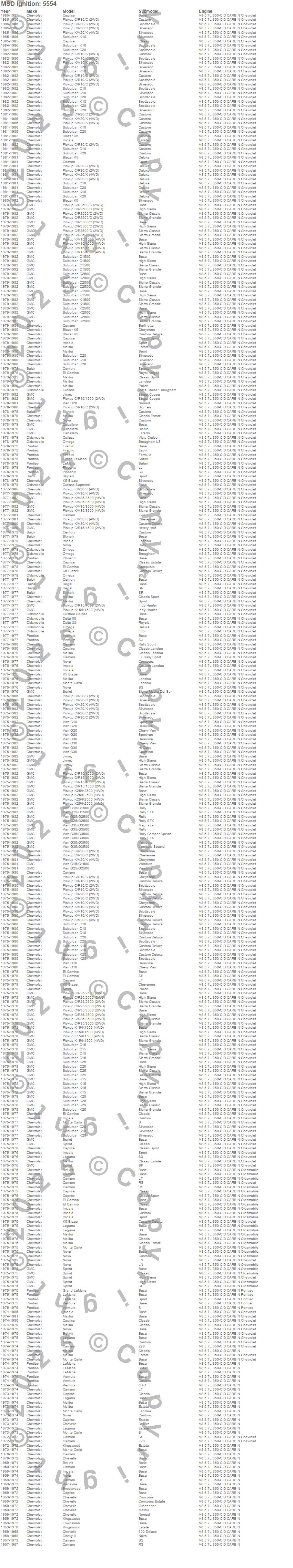 Bel Air, Biscayne, Blazer K5, Brookwood, C10 Pickup, C10 Suburban, C15 Suburban, C1500 Pickup, C1500 Suburban, C20 Pickup, C20 Suburban, C25 Suburban, C25/C2500 Pickup, C2500 Pickup, C2500 Suburban, C30 Pickup, C35/C3500 Pickup, C3500 Pickup, Caballero, Camaro