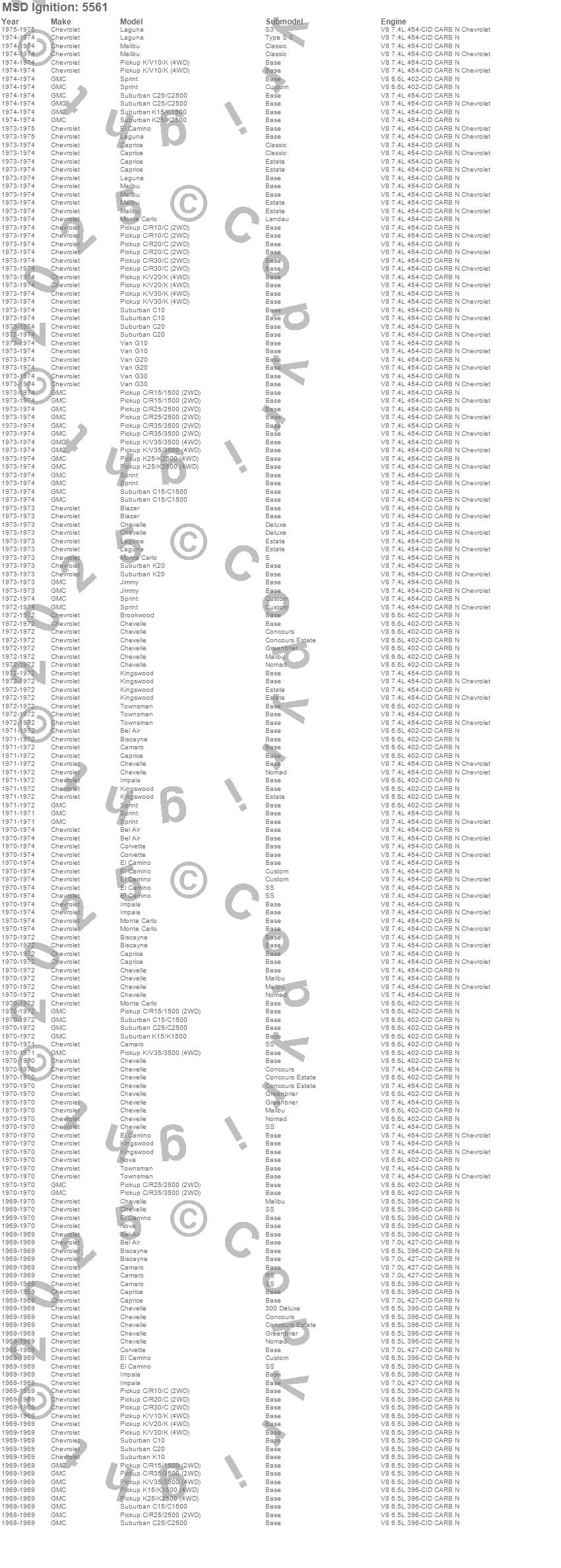Bel Air, Biscayne, Blazer, Brookwood, C10 Pickup, C10 Suburban, C15/C1500 Suburban, C1500 Pickup, C20 Pickup, C20 Suburban, C25/C2500 Pickup, C25/C2500 Suburban, C30 Pickup, C35/C3500 Pickup, Camaro, Caprice, Chevelle, Corvette, El Camino, G10 Van