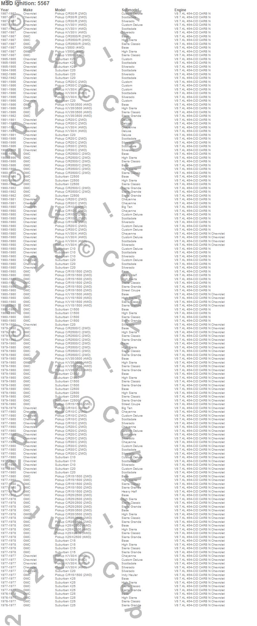 C10 Pickup, C10 Suburban, C15 Suburban, C1500 Pickup, C1500 Suburban, C20 Pickup, C20 Suburban, C25 Suburban, C25/C2500 Pickup, C2500 Pickup, C2500 Suburban, C30 Pickup, C35/C3500 Pickup, C3500 Pickup, K1500 Pickup, K20 Suburban, K25 Pickup, K25 Suburban, K30 Pickup, K3500 Pickup