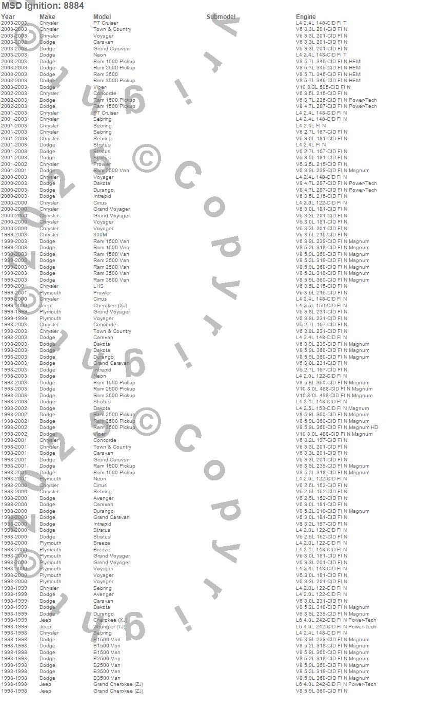 300M, Avenger, B1500 Van, B2500 Van, B3500 Van, Breeze, Caravan, Cherokee (XJ), Cirrus, Concorde, Dakota, Durango, Grand Caravan, Grand Cherokee (ZJ), Grand Voyager, Intrepid, LHS, Neon, Prowler, PT Cruiser