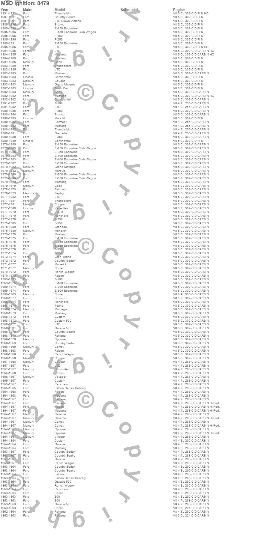 300, Bronco, Caliente, Capri, Comet, Commuter, Continental, Cougar, Country Sedan, Country Squire, Custom, Custom 500, Cyclone, E-100 Econoline, E-100 Econoline Club Wagon, E-150 Econoline, E-150 Econoline Club Wagon, E-200 Econoline, E-250 Econoline, E-250 Econoline Club Wagon