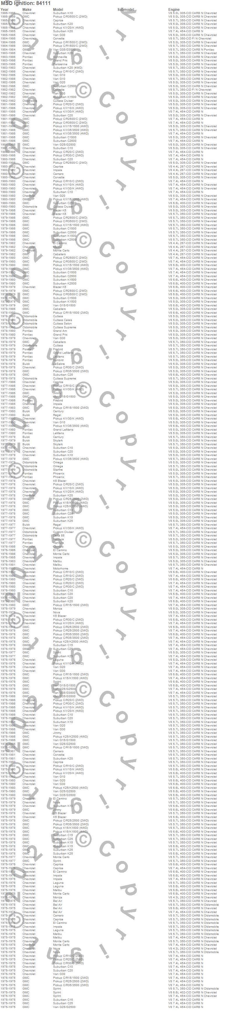 Bel Air, Blazer K5, Bonneville, C10 Pickup, C10 Suburban, C15 Suburban, C1500 Pickup, C1500 Suburban, C20 Pickup, C20 Suburban, C25 Suburban, C25/C2500 Pickup, C2500 Pickup, C2500 Suburban, C30 Pickup, C35/C3500 Pickup, C3500 Pickup, Caballero, Camaro, Caprice
