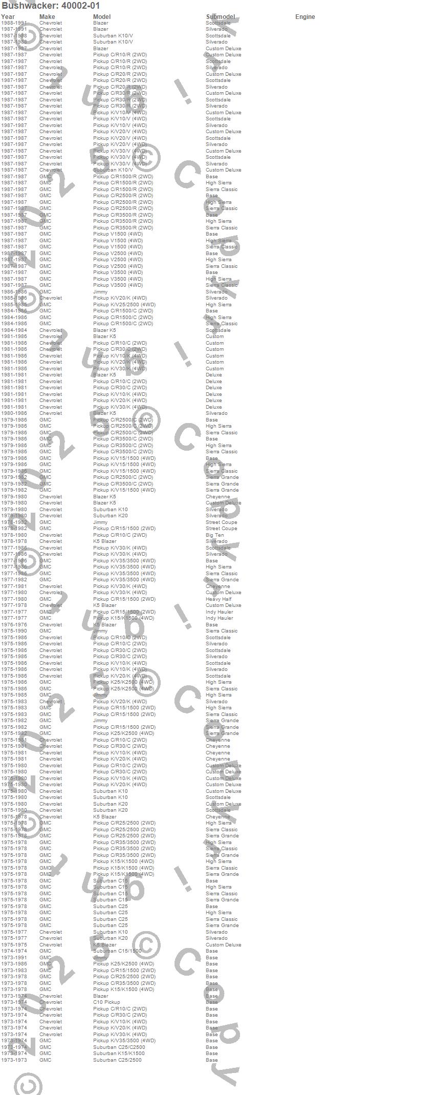 Blazer, Blazer K5, C10 Pickup, C15 Suburban, C15/C1500 Suburban, C1500 Pickup, C25 Suburban, C25/C2500 Pickup, C25/C2500 Suburban, C2500 Pickup, C30 Pickup, C35/C3500 Pickup, C3500 Pickup, Jimmy, K10 Pickup, K10 Suburban, K15/K1500 Suburban, K1500 Pickup, K20 Pickup, K20 Suburban