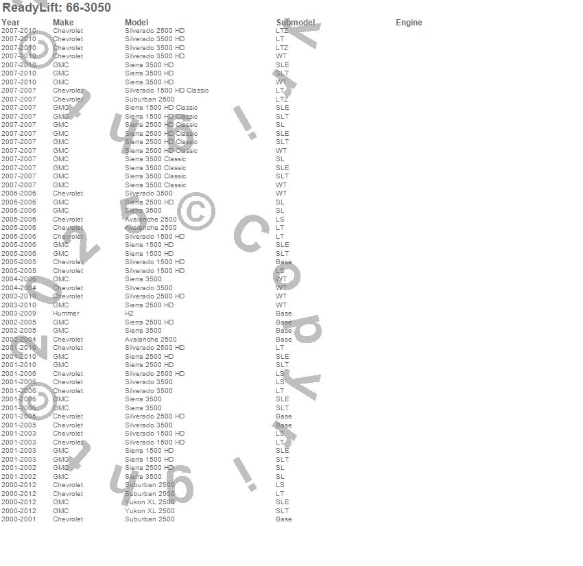 Below is an abbreviated list of applications for the Front Leveling Kit.