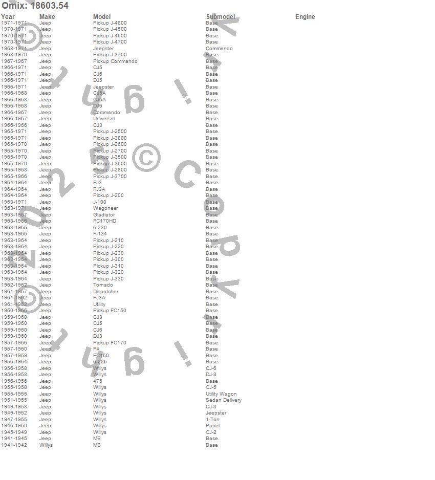 475, 6-226, 6-230, CJ3, CJ5, CJ5A, CJ6, CJ6A, Commando, Dispatcher, DJ3, DJ5, DJ6, F-134, F4, FC150, FC170, FC170HD, FJ3, FJ3A