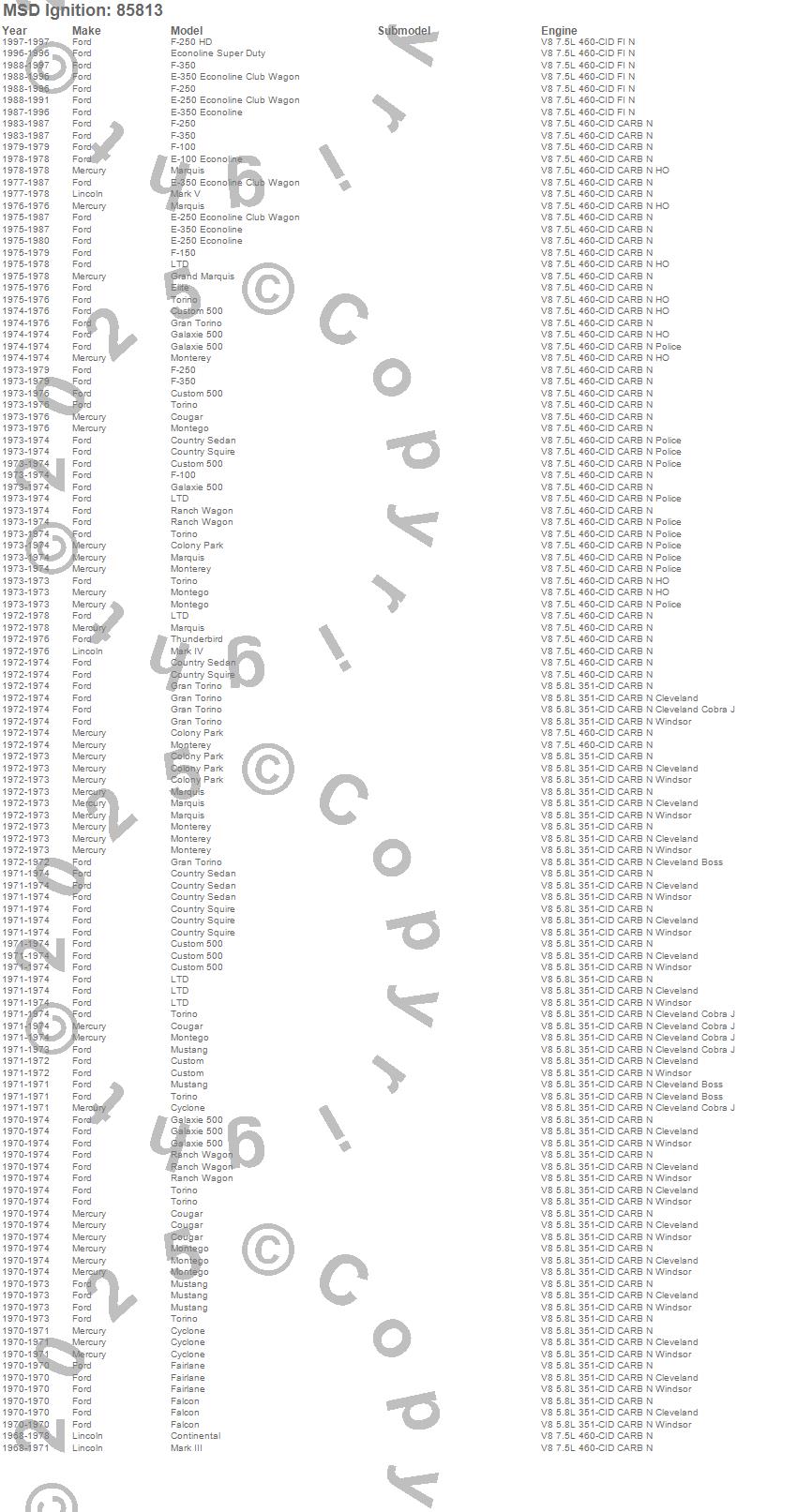 Colony Park, Continental, Cougar, Country Sedan, Country Squire, Custom, Custom 500, Cyclone, E-100 Econoline, E-250 Econoline, E-250 Econoline Club Wagon, E-350 Econoline, E-350 Econoline Club Wagon, Econoline Super Duty, Elite, F-100, F-150, F-250, F-250 HD, F-350