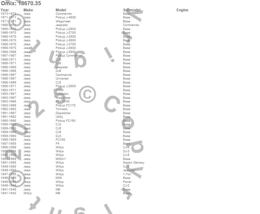 CJ3, CJ5, CJ6, Commando, Dispatcher, DJ3, DJ6, F4, FC150, FC170, FC170HD, Gladiator, J-100, J-2500, J-2600, J-2700, J-2800, J-3500, J-3600, J-3700