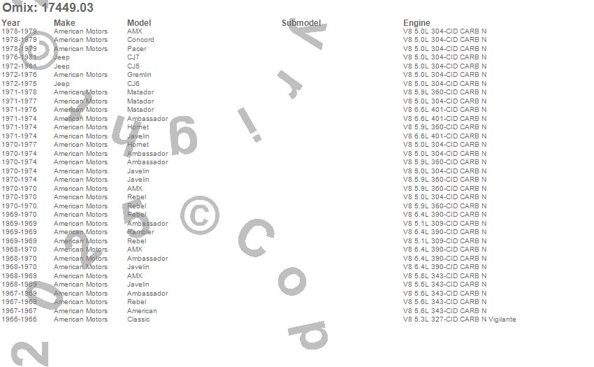 Ambassador, American, AMX, CJ5, CJ6, CJ7, Classic, Concord, Gremlin, Hornet, Javelin, Matador, Pacer, Rambler, Rebel, American Motors, Jeep, 1981, 1980, 1979