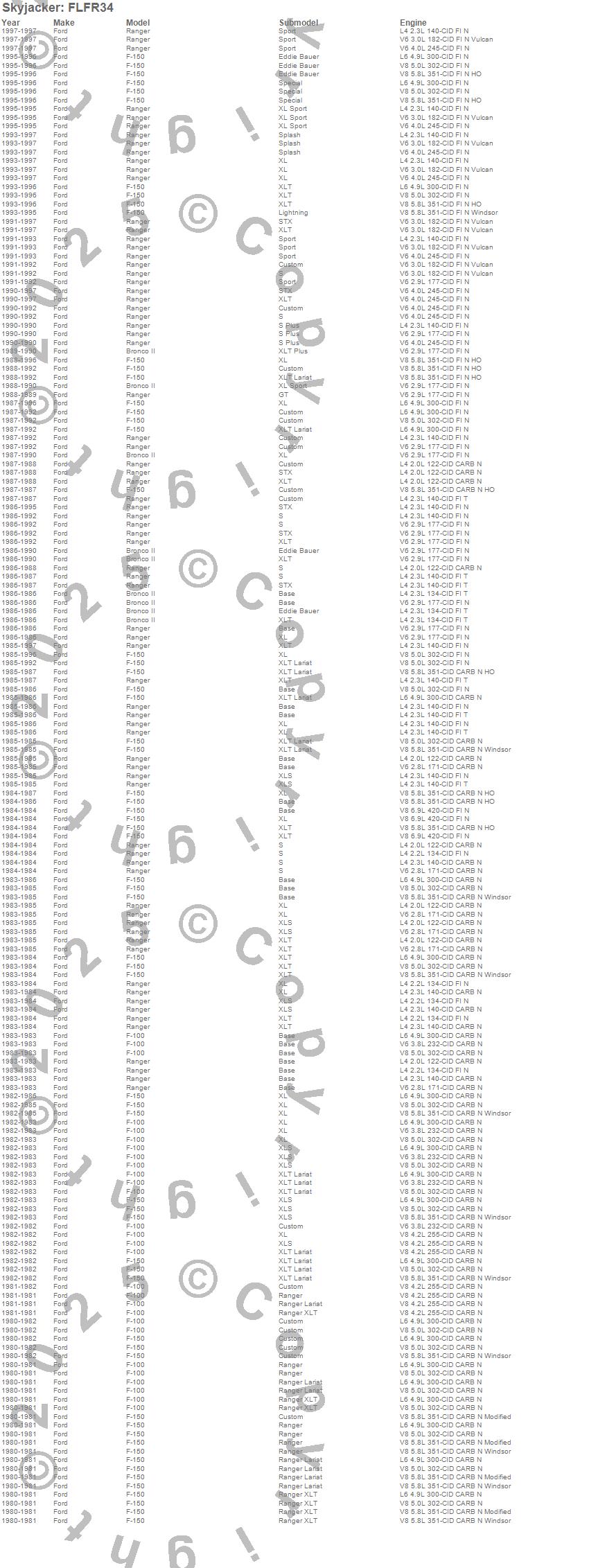 Bronco II, F-100, F-150, Ranger, Ford, 1997, 1996, 1995, 1994, 1993, 1992, 1991, 1990, 1989, 1988, 1987, 1986, 1985, 1984, 1983