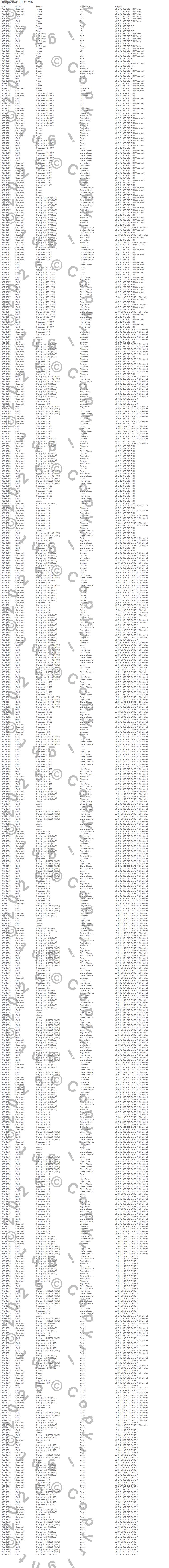 Blazer, Jimmy, K10 Pickup, K10 Suburban, K15 Suburban, K15/K1500 Suburban, K1500 Pickup, K1500 Suburban, K20 Pickup, K20 Suburban, K25 Pickup, K25 Suburban, K25/K2500 Pickup, K25/K2500 Suburban, K2500 Pickup, K2500 Suburban, S15 Jimmy, Tahoe, V10 Pickup, V10 Suburban