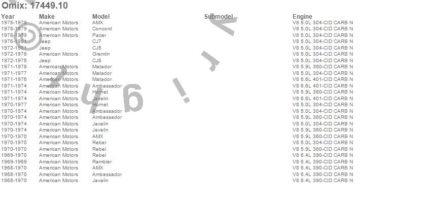 Ambassador, AMX, CJ5, CJ6, CJ7, Concord, Gremlin, Hornet, Javelin, Matador, Pacer, Rambler, Rebel, American Motors, Jeep, 1981, 1980, 1979, 1978, 1977