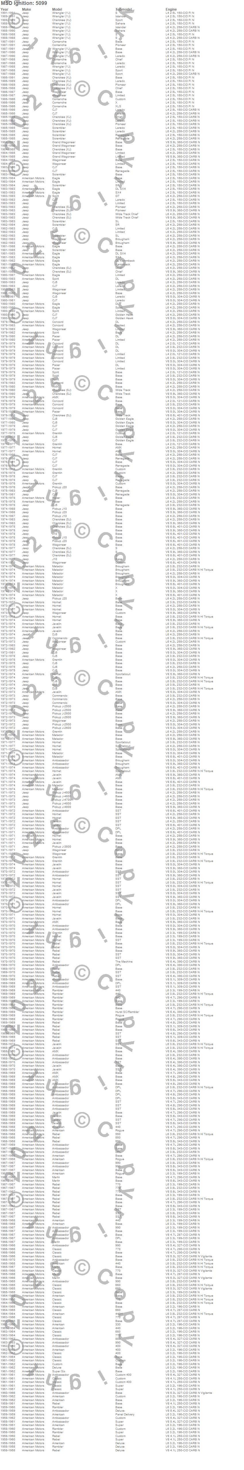 Ambassador, American, AMX, Cherokee (SJ), Cherokee (XJ), CJ5, CJ6, CJ7, Classic, Comanche, Commando, Concord, Custom, Deluxe, DJ5, Eagle, Grand Wagoneer, Gremlin, Hornet, J-2500