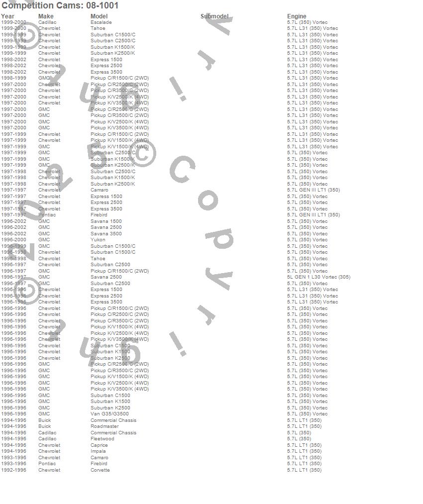C1500 Pickup, C1500 Suburban, C2500 Pickup, C2500 Suburban, C3500 Pickup, Camaro, Caprice, Commercial Chassis, Corvette, Escalade, Express 1500, Express 2500, Express 3500, Firebird, Fleetwood, G35/G3500 Van, Impala, K1500 Pickup, K1500 Suburban, K2500 Pickup