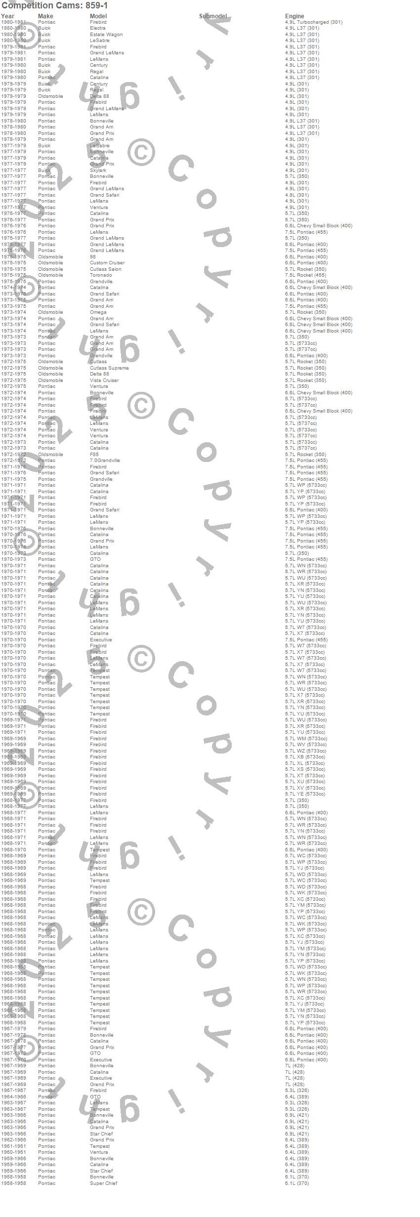 98, Bonneville, Catalina, Catalina Ventura, Century, Custom Cruiser, Cutlass, Cutlass Salon, Cutlass Supreme, Delta 88, Electra, Estate Wagon, Executive, F85, Firebird, Firebird Trans Am, Grand Am, Grand LeMans, Grand Prix, Grand Safari