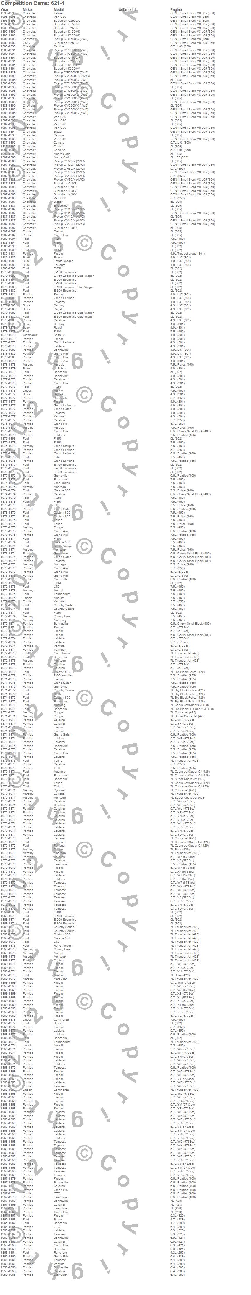 Blazer, Bonneville, Bronco, C1500 Pickup, C1500 Suburban, C2500 Pickup, C2500 Suburban, C3500 Pickup, Camaro, Caprice, Catalina, Catalina Ventura, Century, Club Cargo, Colony Park, Continental, Corvette, Cougar, Country Sedan, Country Squire