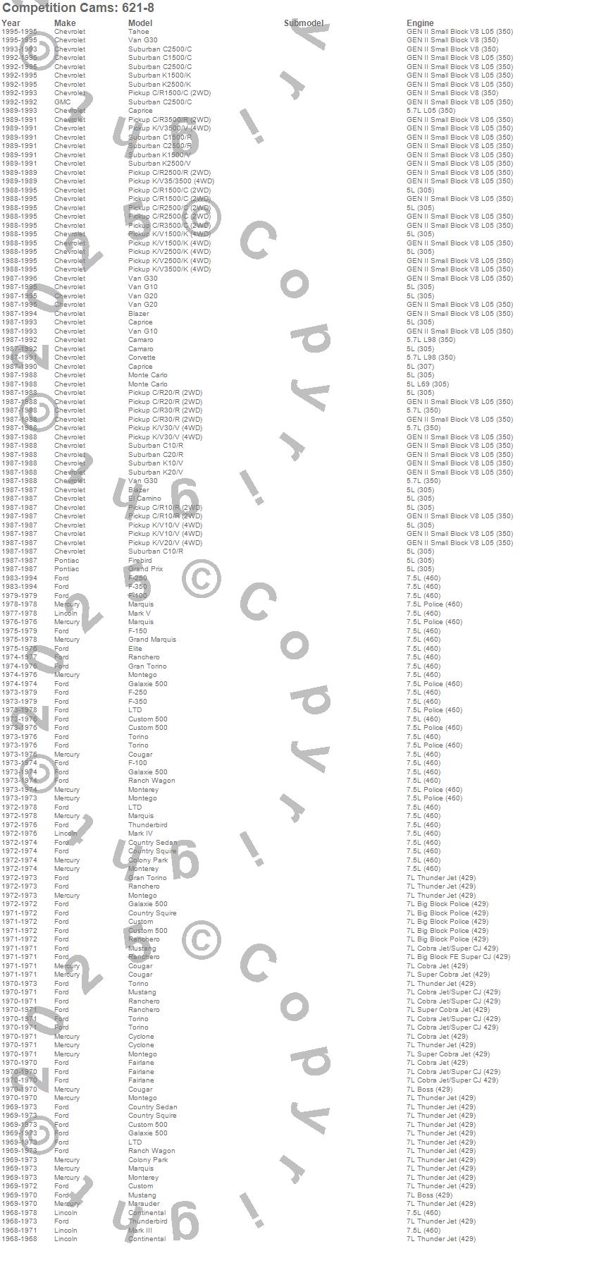 Blazer, C1500 Pickup, C1500 Suburban, C2500 Pickup, C2500 Suburban, C3500 Pickup, Camaro, Caprice, Colony Park, Continental, Corvette, Cougar, Country Sedan, Country Squire, Custom, Custom 500, Cyclone, El Camino, Elite, F-100