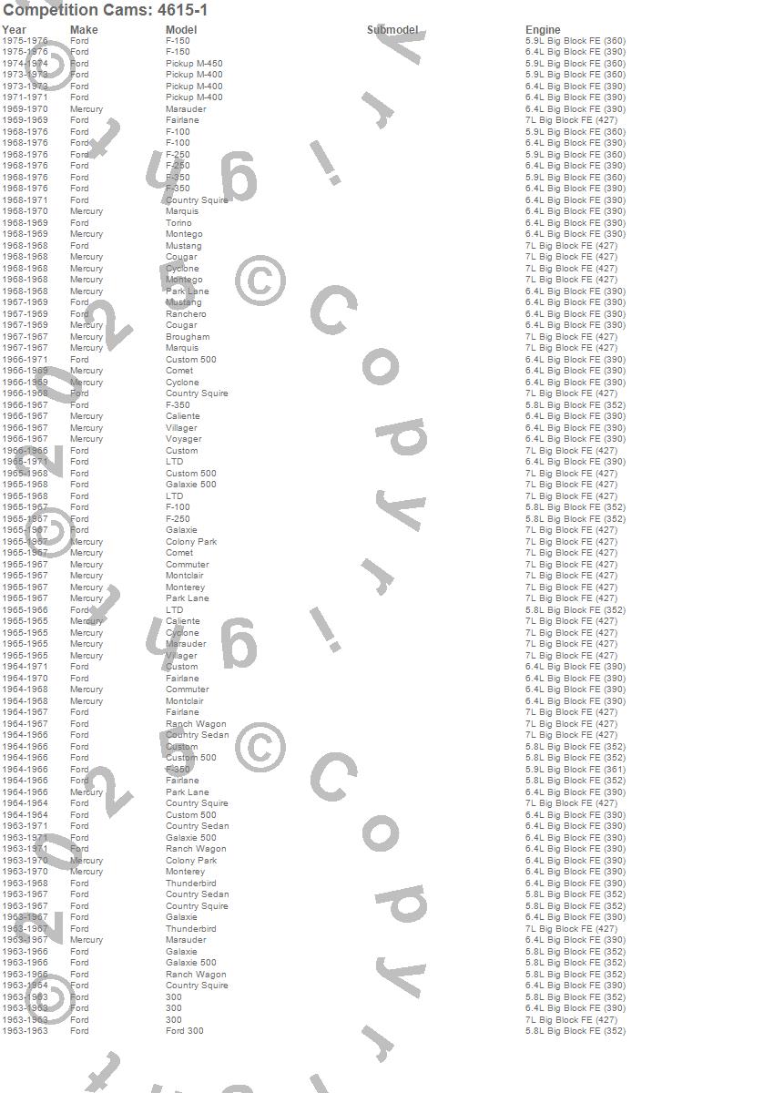 Breezeway, Brougham, Caliente, Colony Park, Comet, Commuter, Cougar, Country Sedan, Country Squire, Custom, Custom 500, Cyclone, F-100, F-150, F-250, F-350, Fairlane, Ford 300, Galaxie, Galaxie 500