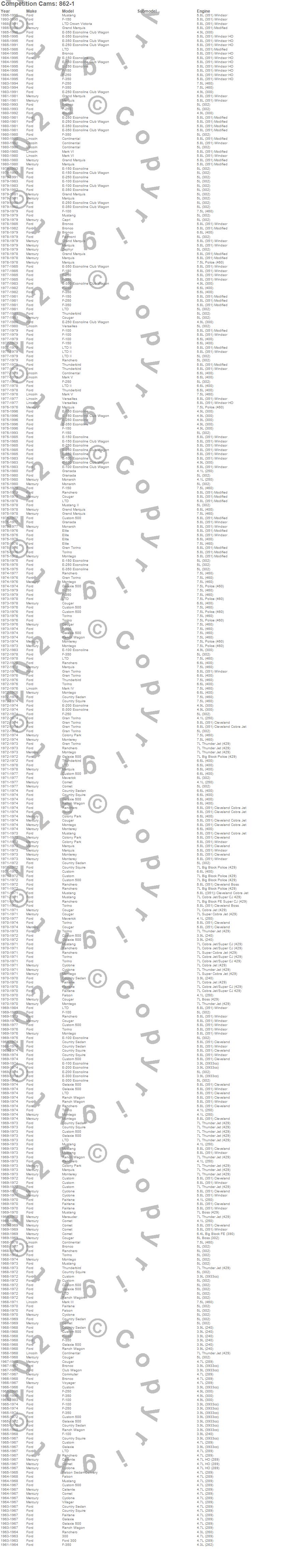 Bronco, Caliente, Capri, Club Cargo, Club Wagon, Colony Park, Comet, Commuter, Continental, Cougar, Country Sedan, Country Squire, Custom, Custom 500, Cyclone, E-100 Econoline, E-100 Econoline Club Wagon, E-150 Econoline, E-150 Econoline Club Wagon, E-200 Econoline