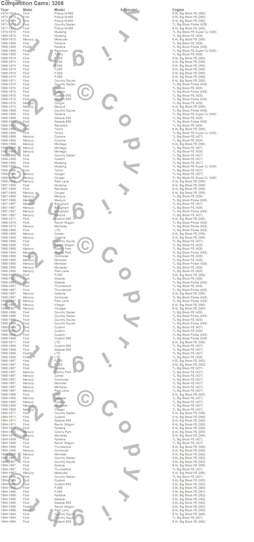 Breezeway, Brougham, Caliente, Colony Park, Comet, Commuter, Cougar, Country Sedan, Country Squire, Custom, Custom 500, Cyclone, F-100, F-250, F-350, Fairlane, Galaxie, Galaxie 500, LTD, M-400 (Pickup)