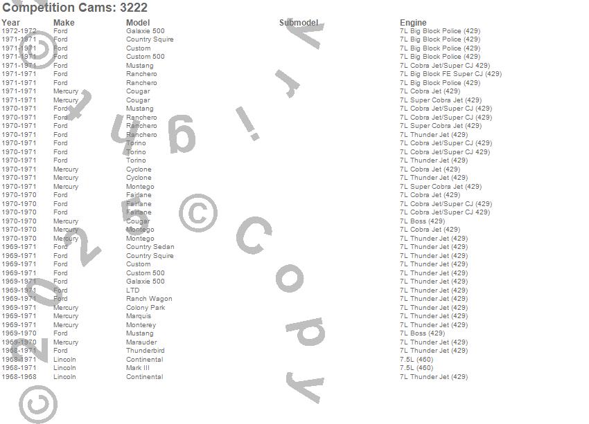 Colony Park, Continental, Cougar, Country Sedan, Country Squire, Custom, Custom 500, Cyclone, Fairlane, Galaxie 500, LTD, Marauder, Mark III, Marquis, Montego, Monterey, Mustang, Ranch Wagon, Ranchero, Thunderbird