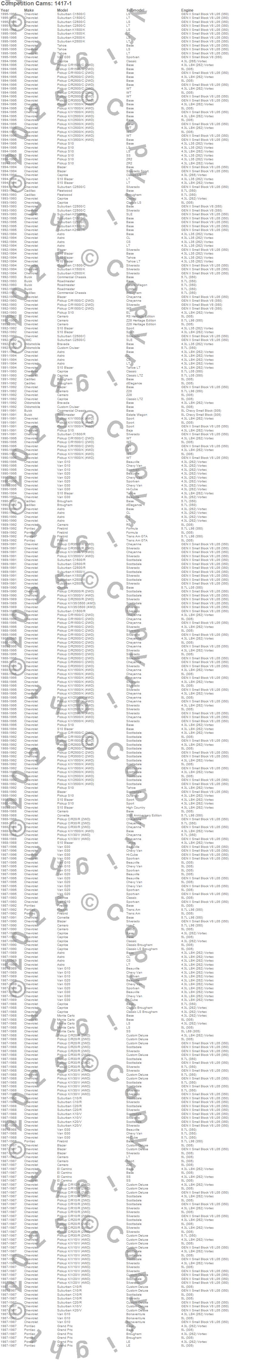 Astro, Blazer, Bravada, Brougham, C1500 Pickup, C1500 Suburban, C2500 Pickup, C2500 Suburban, C3500 Pickup, Camaro, Caprice, Commercial Chassis, Corvette, Custom Cruiser, El Camino, Firebird, Fleetwood, G10 Van, G20 Van, G30 Van