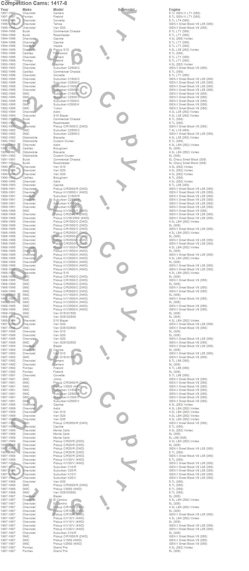 Astro, Blazer, Bravada, Brougham, C1500 Pickup, C1500 Suburban, C2500 Pickup, C2500 Suburban, C3500 Pickup, Camaro, Caprice, Commercial Chassis, Corvette, Custom Cruiser, El Camino, Firebird, Fleetwood, G10 Van, G15/G1500 Van, G20 Van