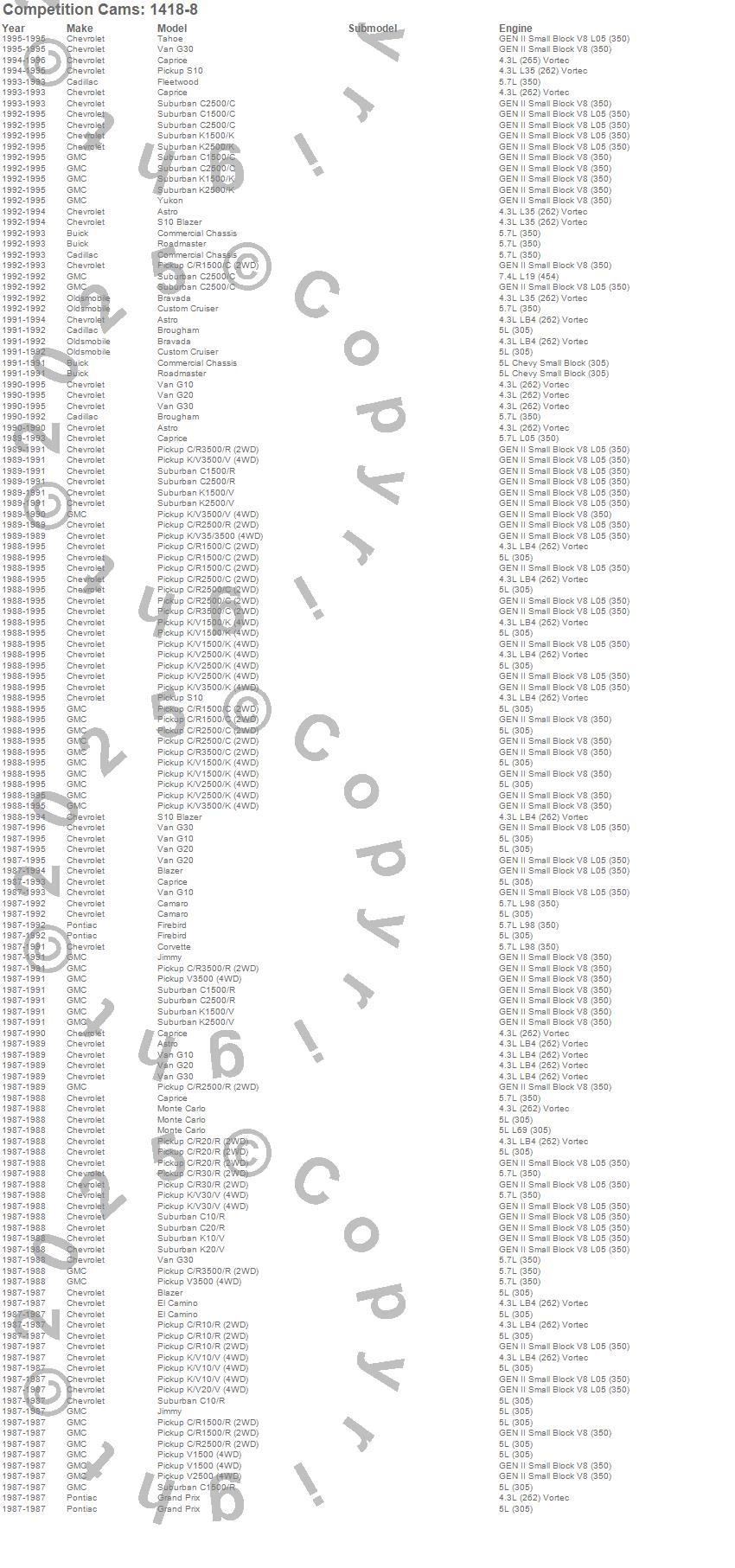 Astro, Blazer, Bravada, Brougham, C1500 Pickup, C1500 Suburban, C2500 Pickup, C2500 Suburban, C3500 Pickup, Camaro, Caprice, Commercial Chassis, Corvette, Custom Cruiser, El Camino, Firebird, Fleetwood, G10 Van, G20 Van, G30 Van