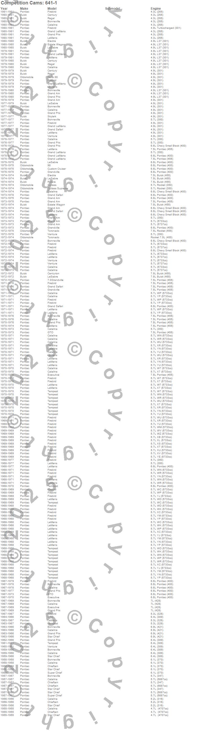 98, Bonneville, Catalina, Catalina Ventura, Centurion, Century, Chieftain, Custom Cruiser, Cutlass, Cutlass Supreme, Delta 88, Electra, Estate Wagon, Executive, Firebird, Firebird Trans Am, Grand Am, Grand LeMans, Grand Prix, Grand Safari