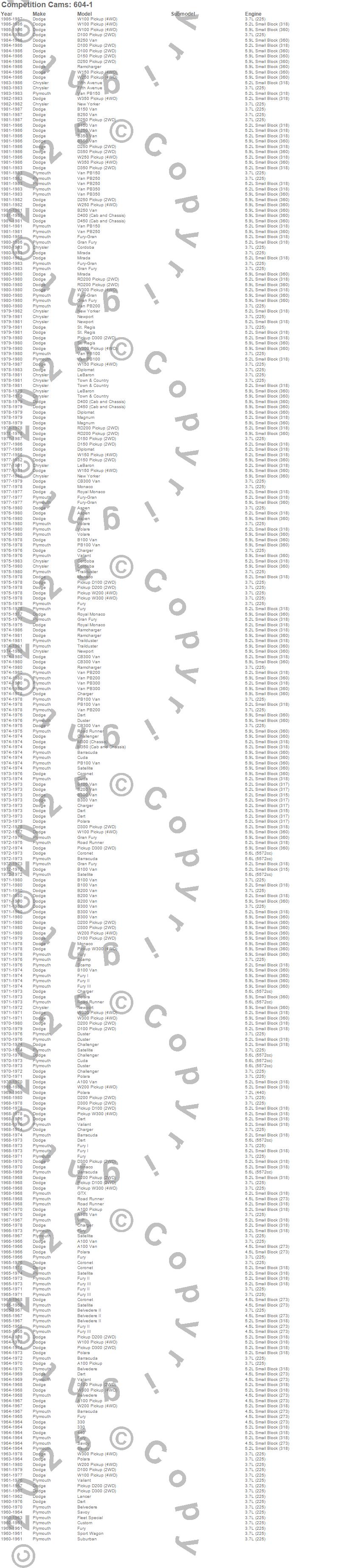330, 440, 880, A100 Van, A108 Van, Aspen, B100 Van, B150 Van, B200 Van, B250 Van, B300 Van, B350 Van, Barracuda, Belvedere, Belvedere II, CB300 Van, Challenger, Charger, Cordoba, Coronet