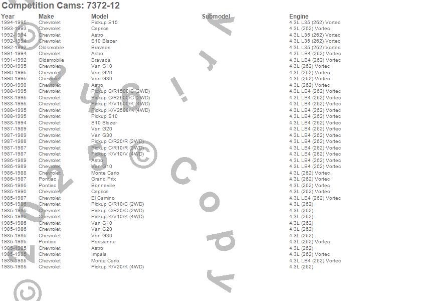 Astro, Bonneville, Bravada, C10 Pickup, C1500 Pickup, C20 Pickup, C2500 Pickup, Caprice, El Camino, G10 Van, G20 Van, G30 Van, Grand Prix, Impala, K10 Pickup, K1500 Pickup, K20 Pickup, K2500 Pickup, Monte Carlo, Parisienne