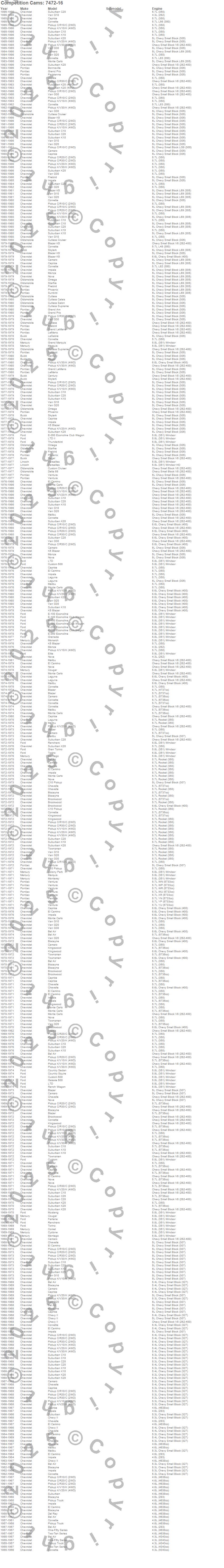 Bel Air, Biscayne, Blazer, Blazer K5, Bonneville, Bronco, Brookwood, C10 Pickup, C10 Suburban, C20 Pickup, C20 Suburban, C30 Pickup, Camaro, Caprice, Century, Chevelle, Chevy II, Colony Park, Comet, Continental